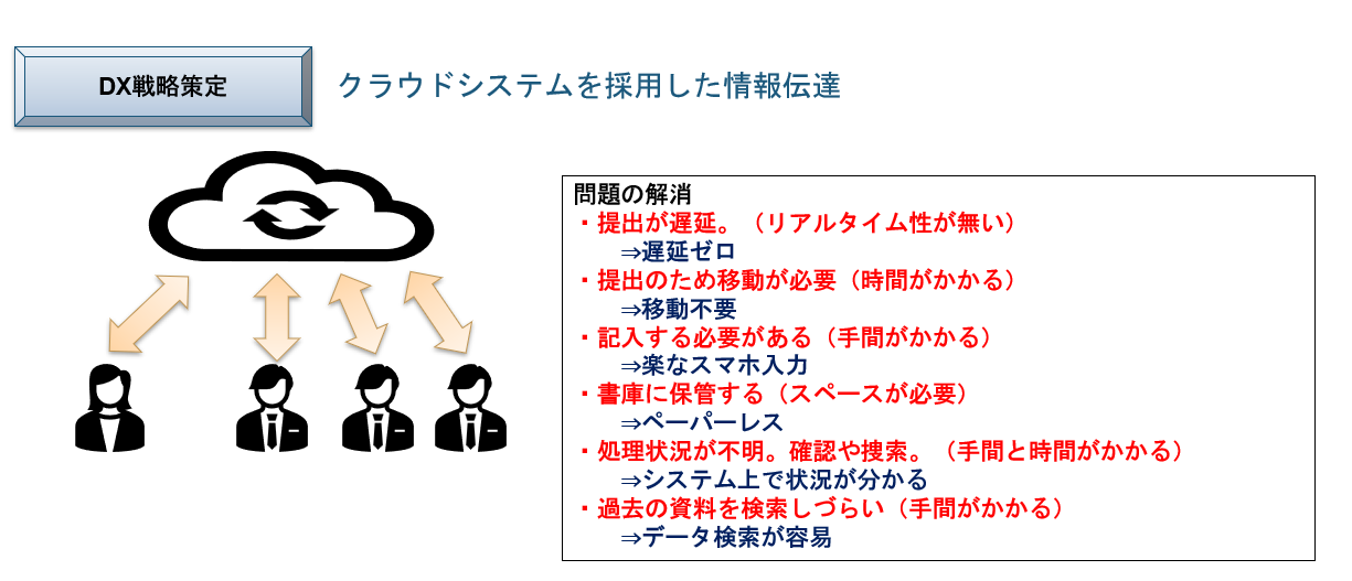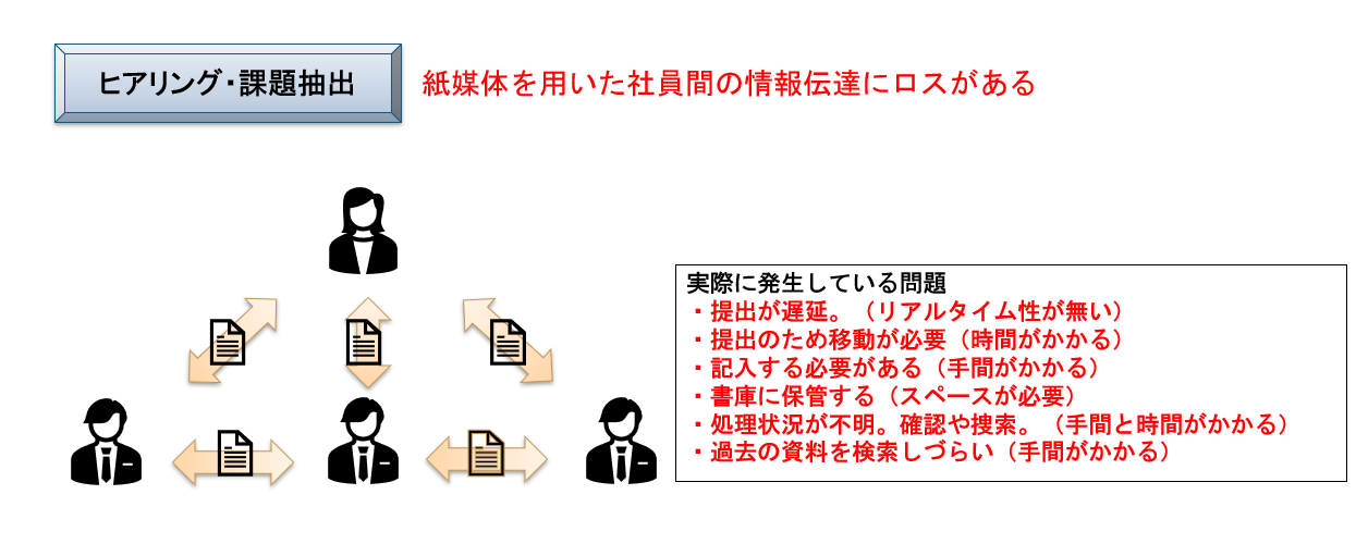 しかし、ヒアリングを続けるとともに、現業務の『紙媒体を用いた社員間の情報伝達』において、改善が見込める潜在的なロスがある状況が分かってきました。