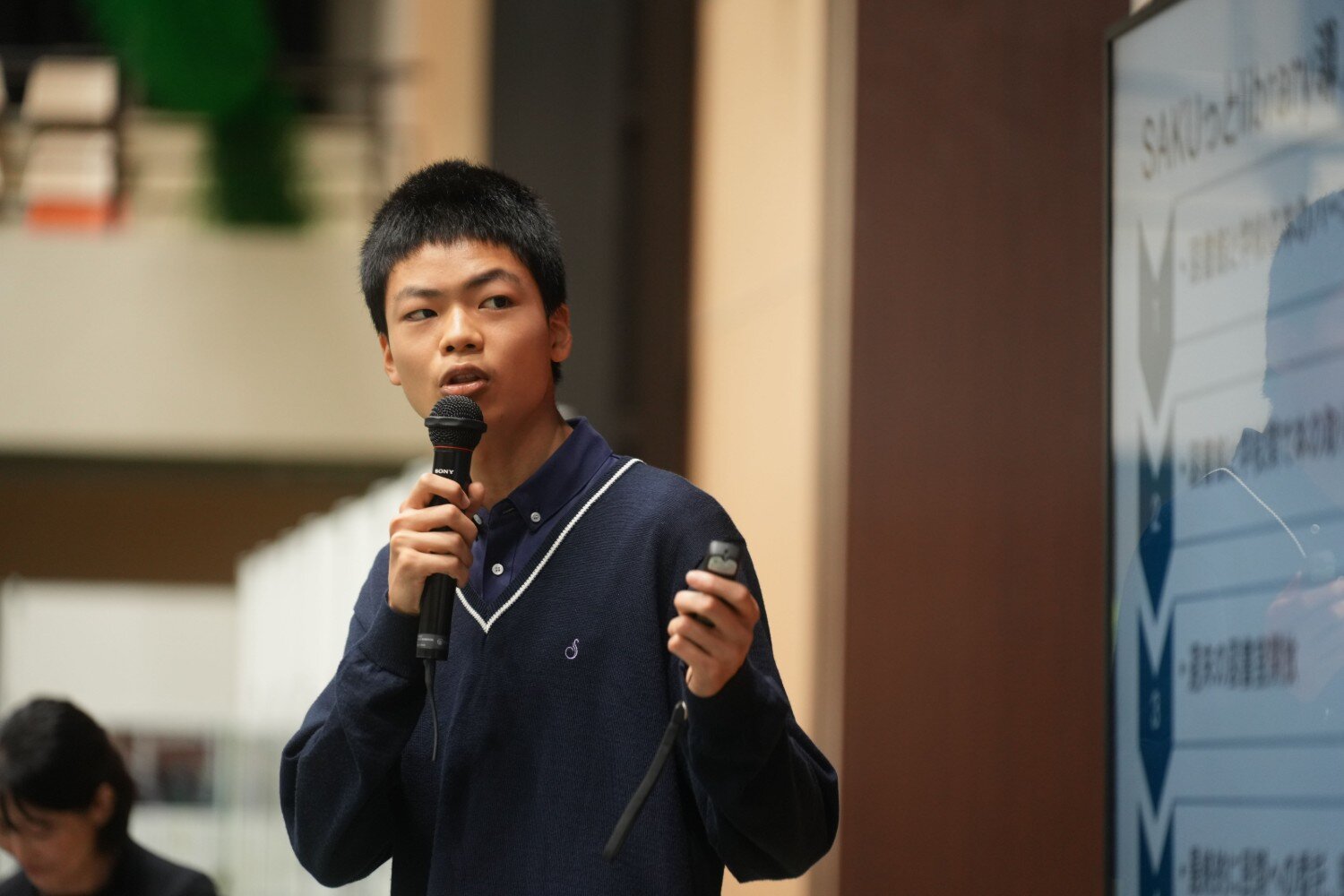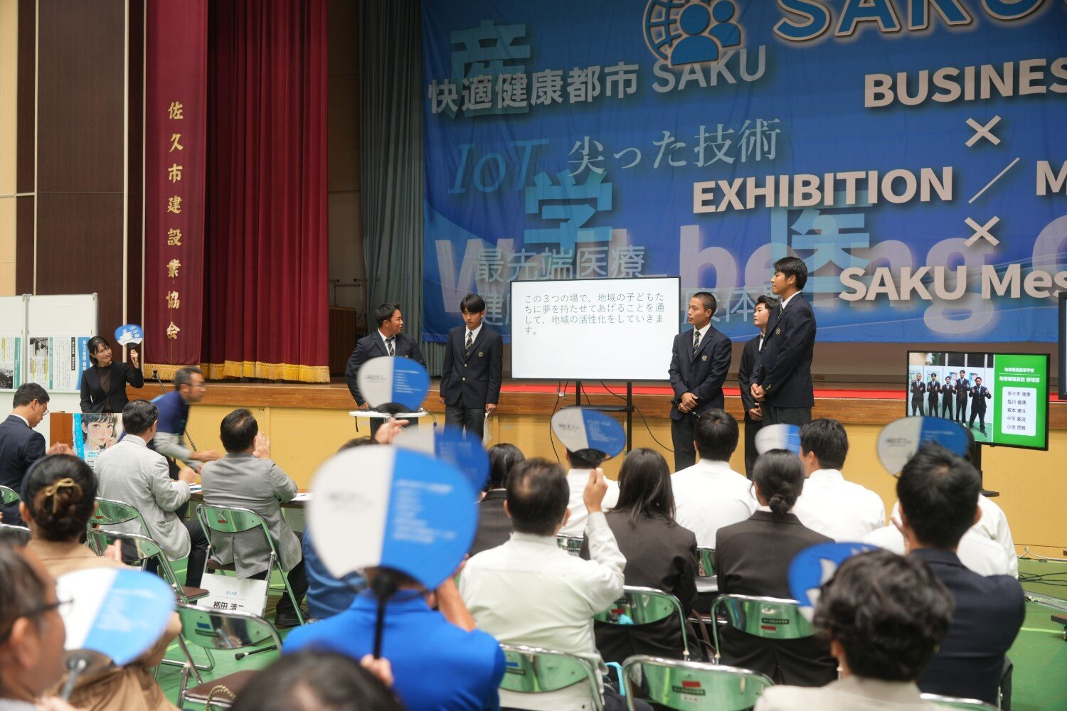 当日は、佐久地域の5校(佐久長聖、野沢北、野沢南、佐久平総合技術、地球環境)から8チーム・計29名の高校生が登壇しました。会場では、観客が「いいね」と書かれたうちわを振って学生たちにエールを送るなど、温かく一体感のある雰囲気の中でプレゼンテーションが進行しました。